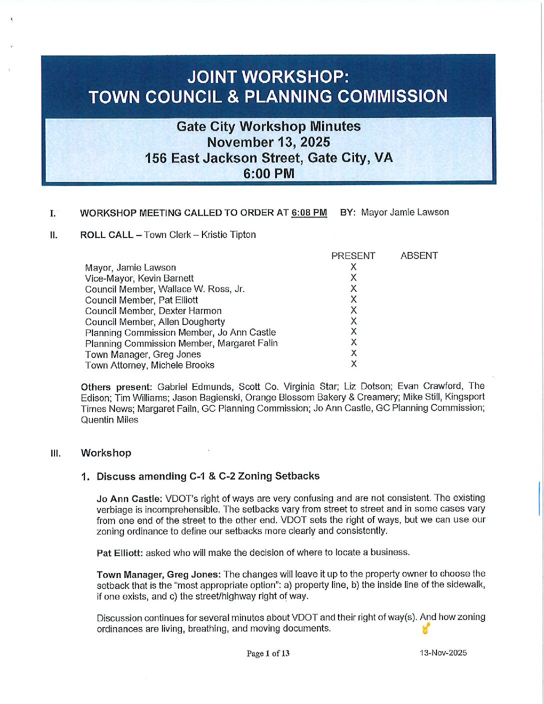 | Joint Workshop: Town Council & Planning Commission | November 13, 2025 | … | Gate City Council Minutes | gate-city-council-minutes | ||